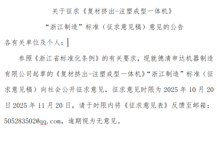 關(guān)于征求《復(fù)材擠出-注塑成型一體機(jī)》 “浙江制造”標(biāo)準(zhǔn)(征求意見稿)意見的公告